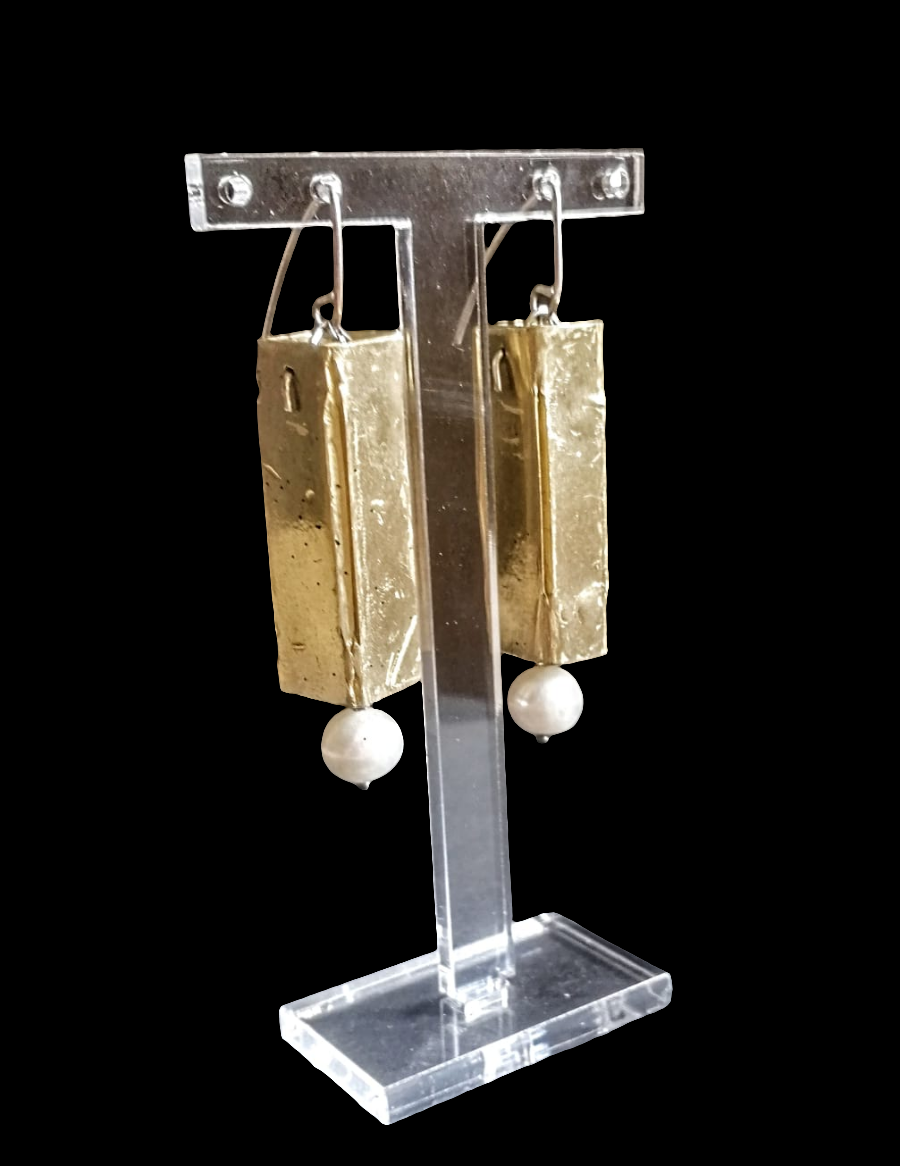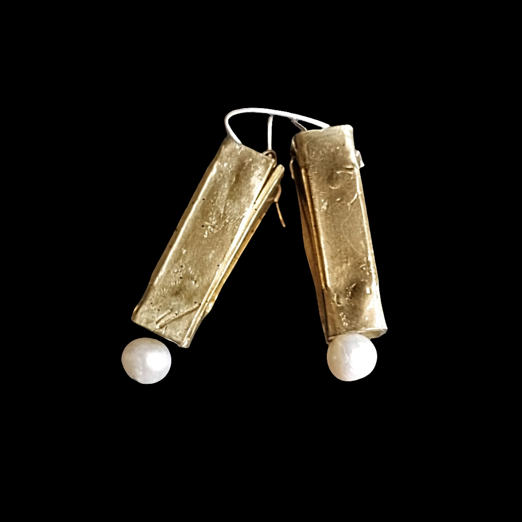 Orecchini pendenti parallelepipedi artigianali in bronzo con perla di fiume